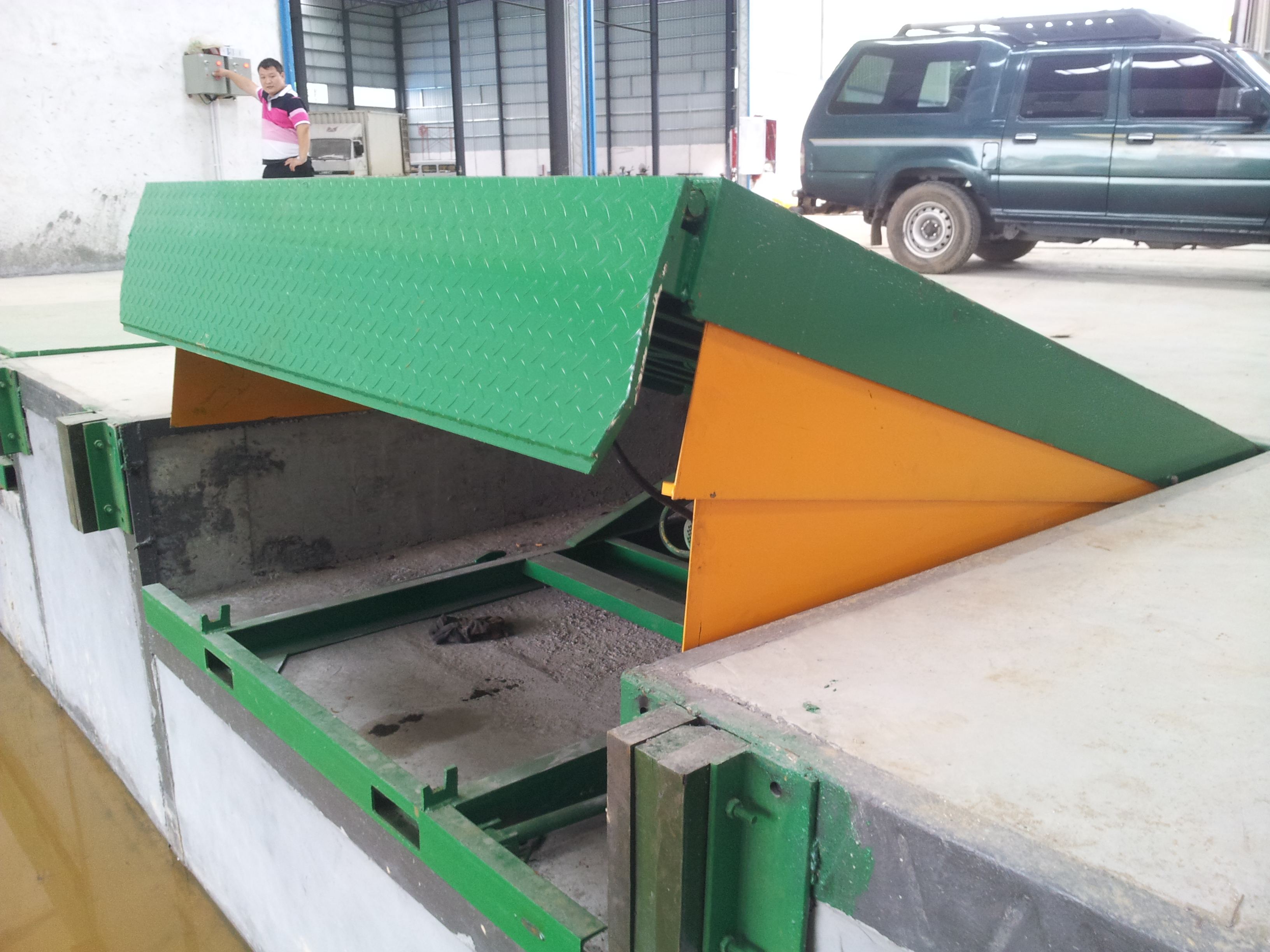 1、電控操作極其簡單,只需按動按鈕,調(diào)節(jié)板會自動升起;松開按鈕,調(diào)節(jié)板靠自重下降, 活頁搭板搭在貨車上即可使用。